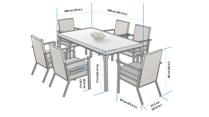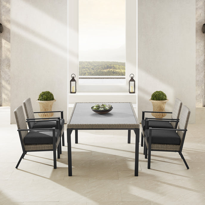 The Santorini dining set brings an airy elegance to outdoor dining with its minimalist, hand-woven synthetic rattan and sleek, powder-coated aluminum legs. The rattan perfectly contrasts with the carbon-colored Sunbrella® cushions, creating a striking, sophisticated aesthetic. The Santorini 7-piece Dining Set offers a refined look that blends effortless style with luxurious comfort, designed to elevate your outdoor space.