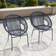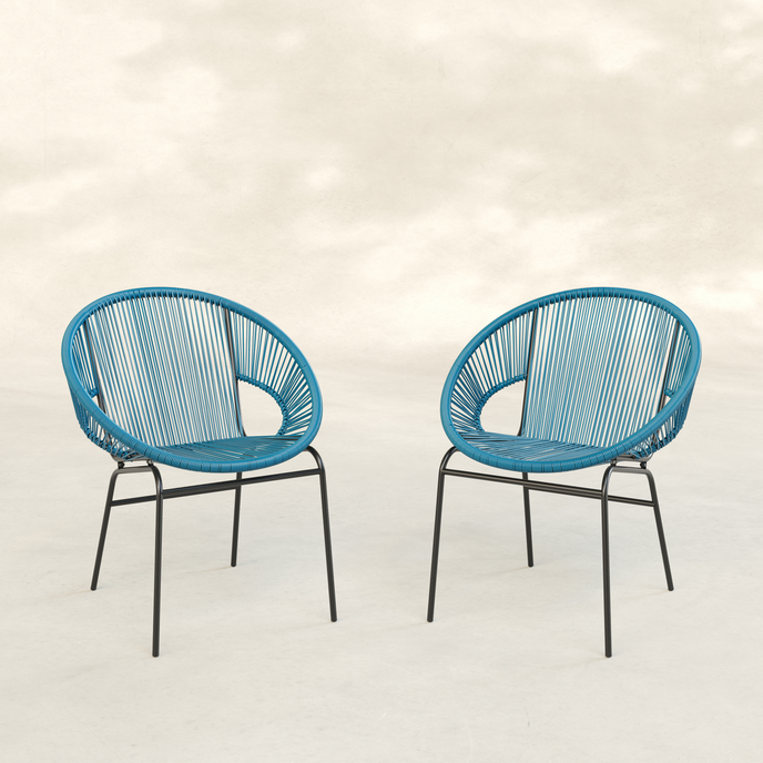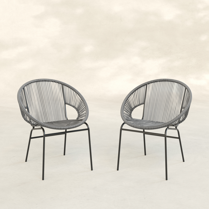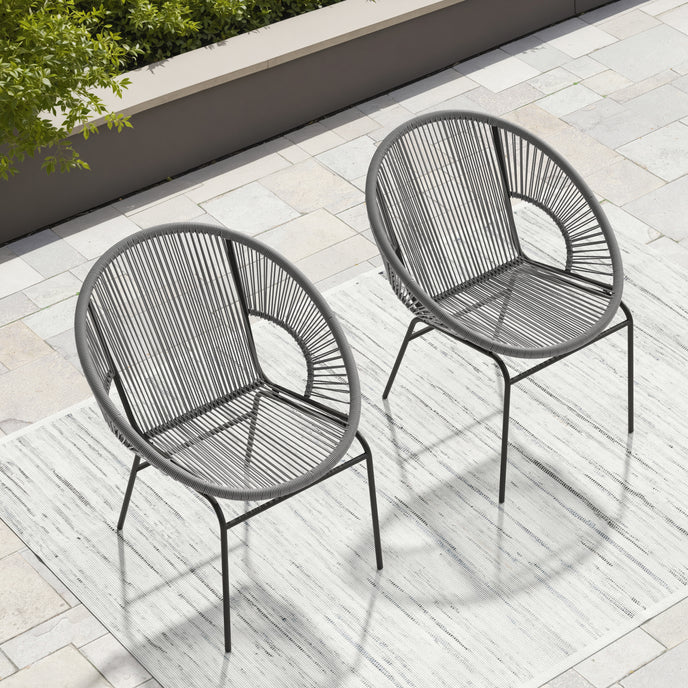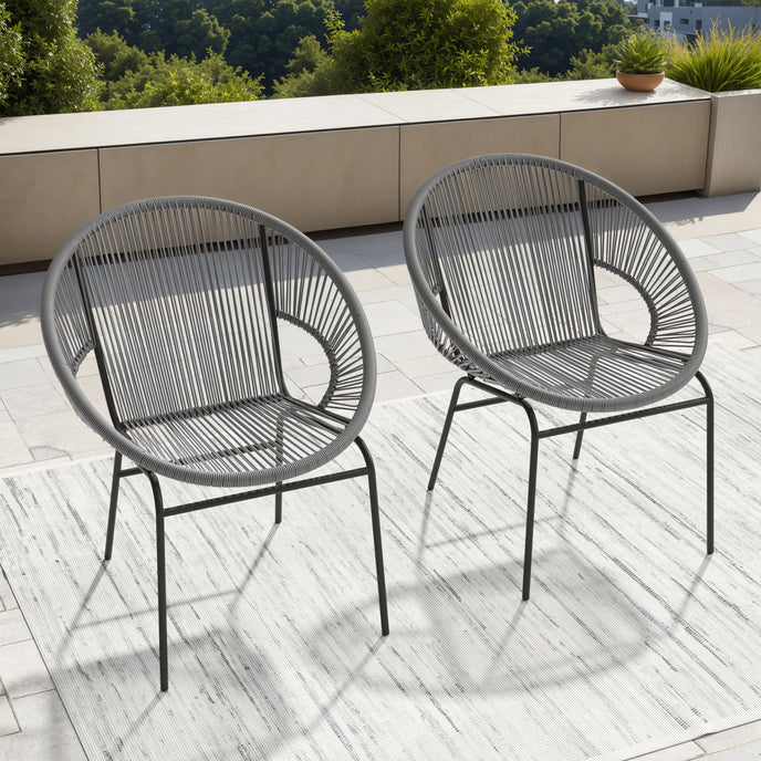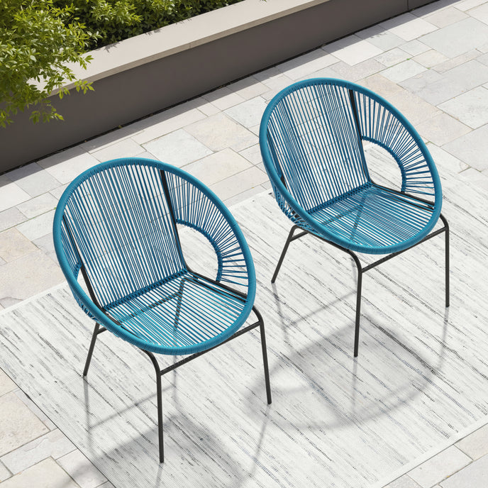 Bring a contemporary flair to your outdoor living space with this set of 2 Acapulco chairs. Constructed from steel frame in black finish, featuring bowl-shaped seat wrapped with wicker in open weave design, these chairs are as durable as they are stylish. Plus, its slight reclined back provides support for relaxation. Whether indoors or outdoors, these chairs are a good addition to enhance your seating decor.