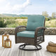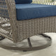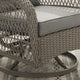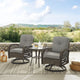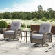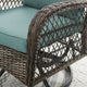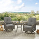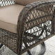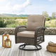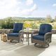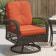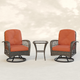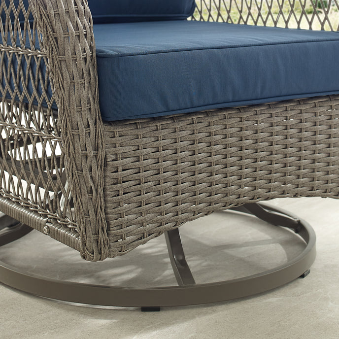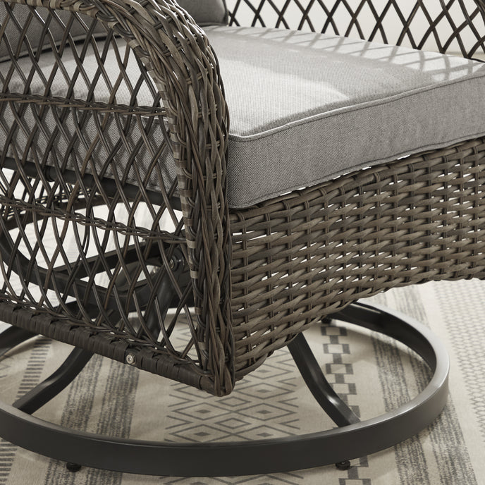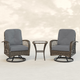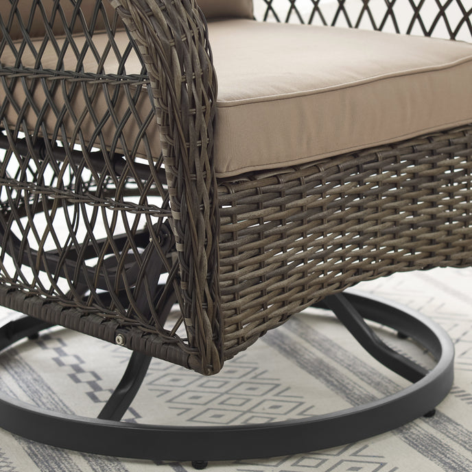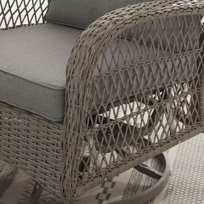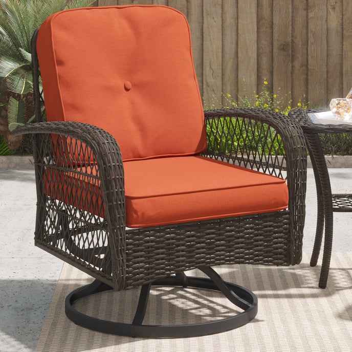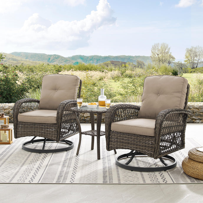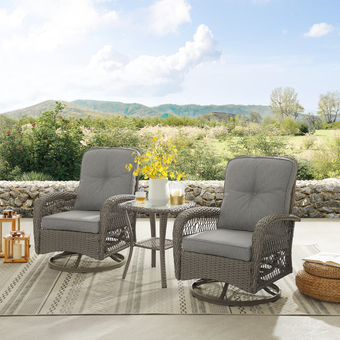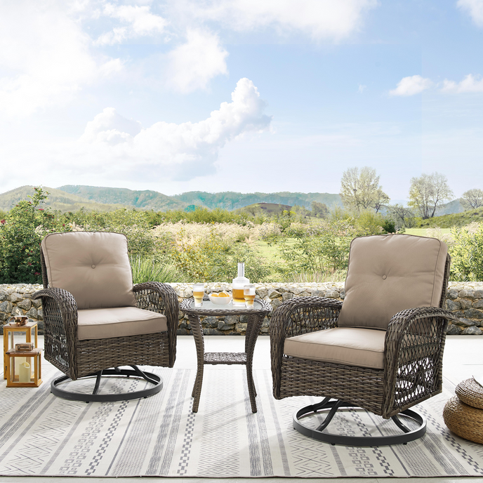 Enjoy sunny days or relaxed evenings on your porch with this charming 2-person patio set. It includes two rotating gliding chairs and a round cocktail table, perfect for watching kids play or catching up with a friend. The chairs feature a sturdy interior steel frame wrapped in breezy wicker rattan, while the tempered glass top of the table offers a stylish surface for snacks and drinks. With UV and weather resistance, this set is built for outdoor enjoyment, and the plush seat and back cushions provide added comfort.