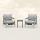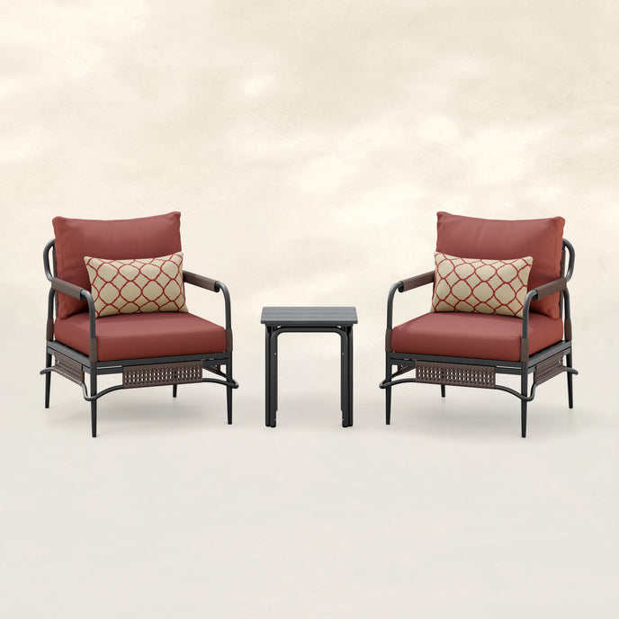 Create a cozy and stylish outdoor retreat with this Aluminum Club Chair Set. Designed for durability and relaxation, this 2-person seating group featuring a tubular frame constructed from aluminum that is both sturdy and rust-resistant. The chair backrest and armrests are adorned with resin wicker for a sophisticated look, while the side table with plastic-wood slat top offers convenience for holding beverages. With included cushions and Sunbrella toss pillows, this set is the perfect combination of comfort and charm for your outdoor space.