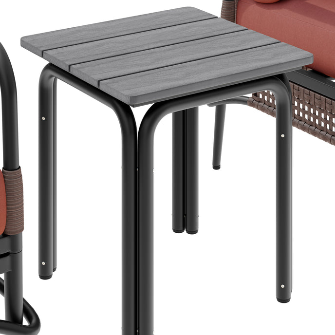 • Material: Powder coated aluminum frame, Chair back wrapped with resin wicker, Plastic-wood table top