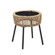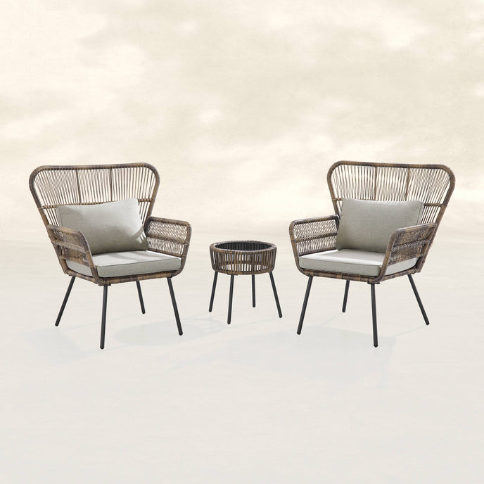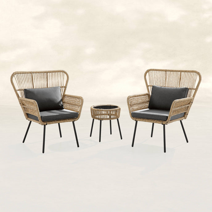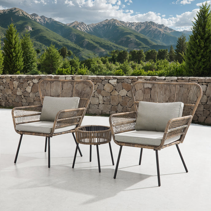 Elevate your patio or balcony with this durable and stylish seating set. Featuring open-weave wicker construction rest on black steel legs, the set combines boho charm with modern flair for a timeless yet on-trend aesthetic. Topped with cushions for enhanced comfort and a glass-top round side table to serve beverages, making it a perfect addition to enjoy outdoor moments.