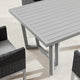 Rectangular dining table featuring slat top with an umbrella hole convenient for shade. Chair seat and back made from HDPE wicker boasting grid pattern, including foam-filled seat cushions upholstered with Sunbrella adding great comfort and easy for maintenance, making this dining set a great addition to elevate your outdoor dining experience.