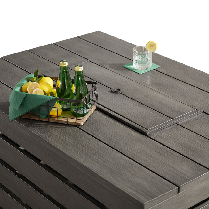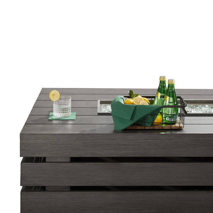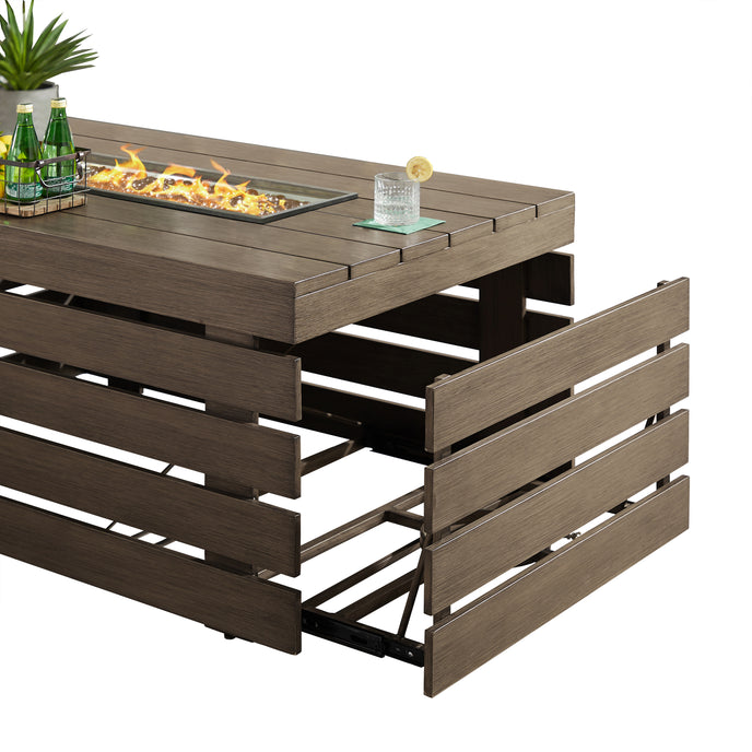 Add a touch of modern warmth to your outdoor space with the Alora Aluminum Fire Table. Constructed from rust-resistant powder-coated aluminum frame featuring slatted design, making it a stylish and durable addition to your patio or deck. With adjustable flame reaching up to 55,000 BTUs, this fire pit table creates perfect ambiance for any occasion. Hidden compartment for propane tank storage (tank not included) keeps the silhouette streamlined, and the included lid allows for full table use when not in fire pit mode. Enjoy the convenience of glass beads and the option for natural gas conversion with this versatile piece.