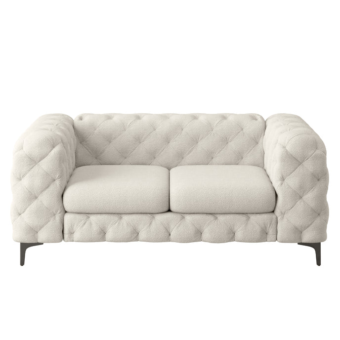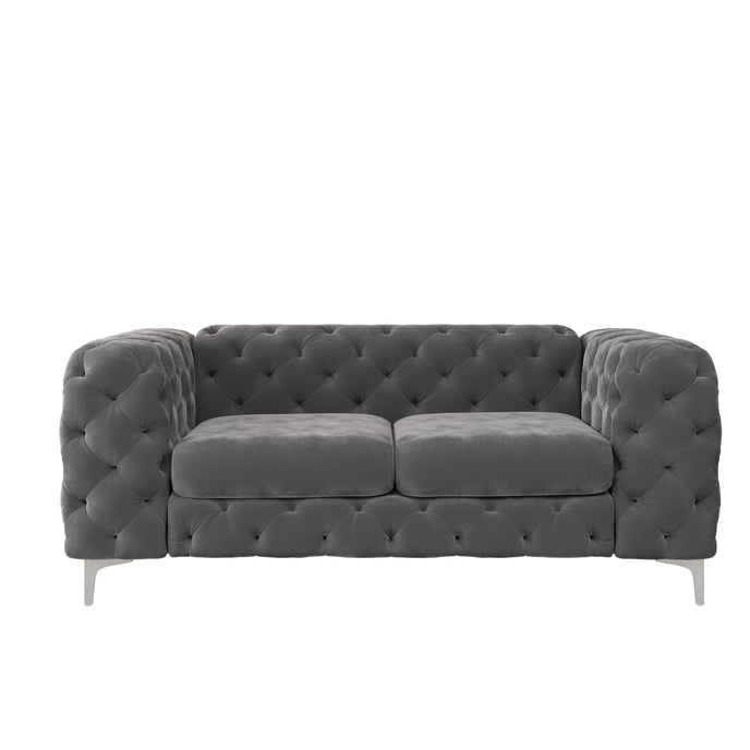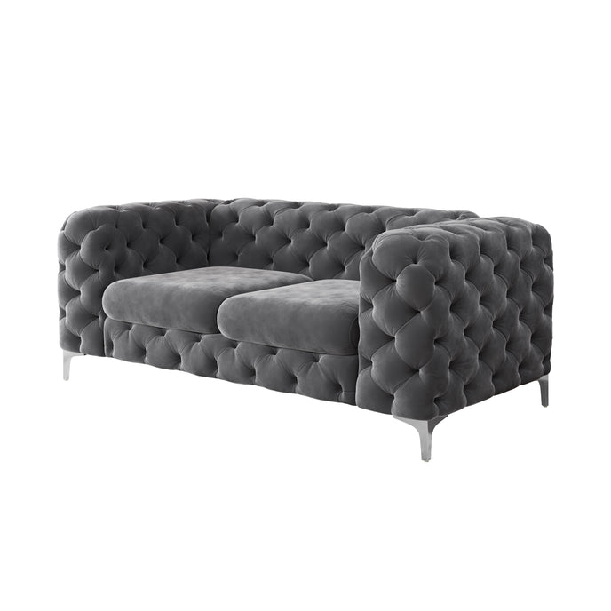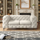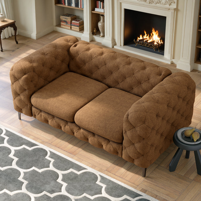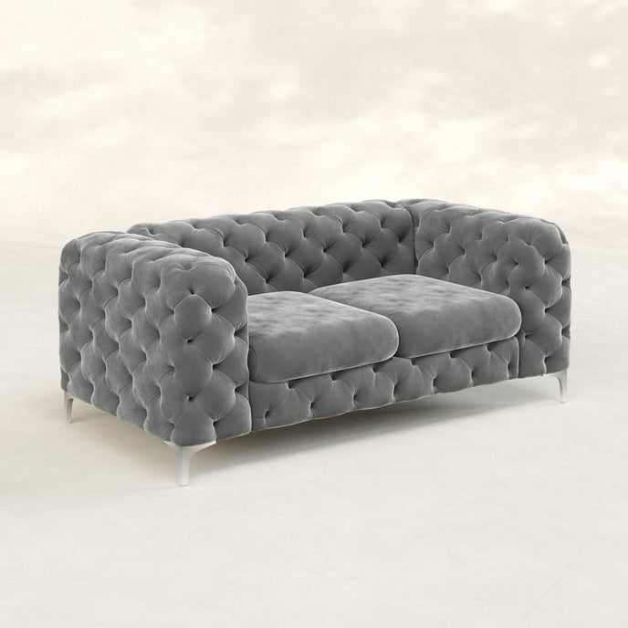 Elevate your living space with our chesterfield-style loveseat, where timeless elegance meets modern comfort. Crafted from solid wood frame, upholstered with soft velvet or polyester that boasts all-over diamond-shape stitch tufting for a touch of sophistication while the metal legs brings a contemporary vibe. Sink into the foam-filled cushion seat that treats yourself to the ultimate in relaxation, making the exquisite loveseat a perfect statement piece to redefine your seating area.