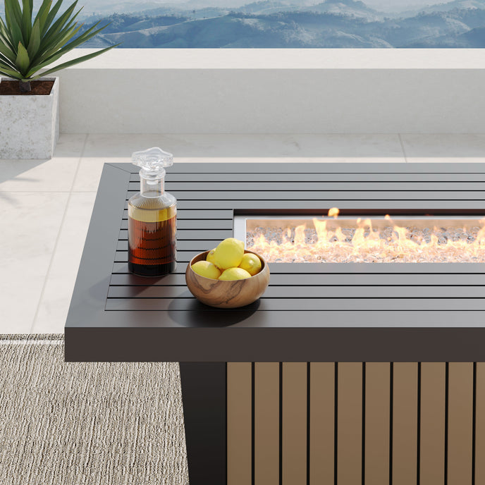 Elevate your outdoor experience with this stunning 55,000 BTU fire pit table, designed to bring warmth and an inviting ambiance to your patio or backyard gatherings. Crafted from powder-coated, slatted aluminum for a sleek, modern aesthetic, it combines durability with sophistication. Effortlessly ignite and control the flame with the convenient push-button and control knob, while a built-in sliding drawer conceals the propane tank (tank not included) for a flawless look. Complete with a matching fire bowl lid, this versatile piece seamlessly transforms into a table when the fire is not in use—perfect for stylish outdoor living.